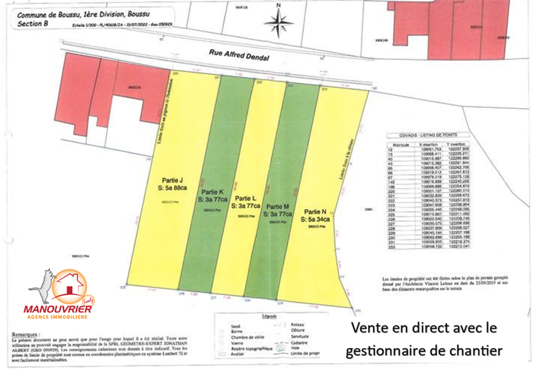 Situé à Boussu-Bois, dans la superbe et prisée vallée du Hanneton dans un cadre verdoyant et paisible, 1 projet neuf cherche son/ses futur(s) propriétaire(s). Le caractère paysager, naturel et l’ambiance « havre de paix » de la vallée ne pourra que vous séduire. Le permis accorde la construction d’une maison 3 F, elle se compose comme suit : • Au rez-de-chaussée : un garage, un hall d’entrée avec WC séparé, séjour, cuisine et une buanderie. • L’étage : trois chambres, une salle de bain fonctionnelle et un hall de nuit. Lot 1 : 5 ares 34 centiares - Faire offre à partir de 39.500€ hors frais (sous réserve d'acceptation des propriétaires) Option 1 : Achat du terrain avec la construction gros œuvre couvert fermé via le gestionnaire de chantier. Faire offre à partir de 225.000 € hors frais par projet. Option 2 : Achat du terrain avec la construction clés sur porte via le gestionnaire de chantier. Faire offre à partir de 260.000 € hors frais par projet. Option 3 : Achat du terrain seul sans construction. Faire offre à partir de 39.500 € hors frais. Honoraires d'agence à charge de l'acquéreur L’agence ne dispose pas du pouvoir de vente ; le propriétaire se réserve le droit d’accepter ou non les offres. Informations communiquées à titre indicatif et non contractuelles. Les rendus ont été réalisés pour vous aider à visualiser la maison et sont non contractuels. Infos/visites : srl.ifm@outlook.be ou 0471/74.79.69. https://www.immofamilymanouvrier.be/fr